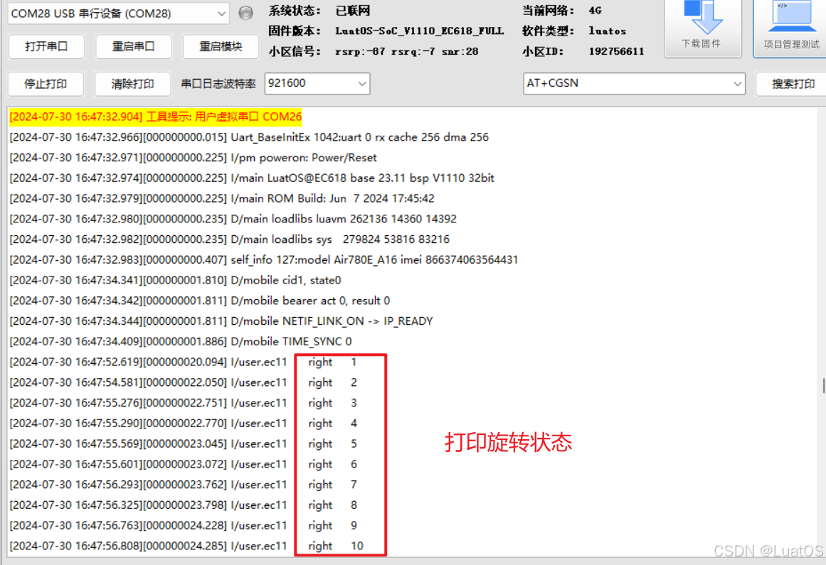下载后旋转旋转编码器,可以到Luatools工具中打印旋转状态,来验证我们的程序是否能够成功运行。