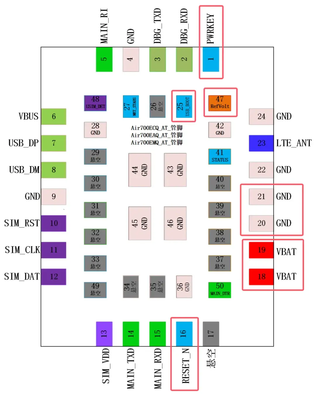 USB_BOOT是模组进入下载模式的控制管脚,必须在模组开机启动时USB_BOOT管脚处于高状态(Air700ECQ/EAQ/EMQ使用RefVolt管脚来拉高),才会让系统进入下载模式。