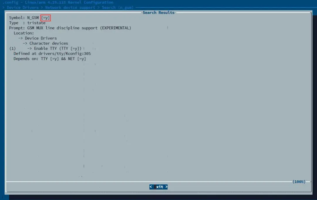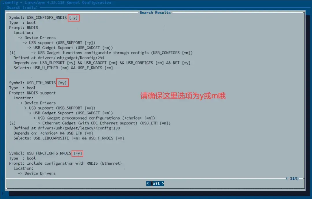 进入内核配置界面,按下"/",可以搜索想要改的地方。比如搜索RNDIS时,如果相关配置项很多,这个界面下可以滚动鼠标查看,确保搜索结果中与RNDIS相关的选项状态为y或m: