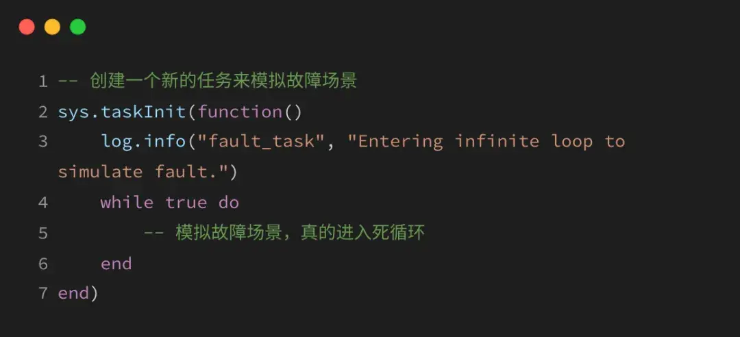 在故障场景模拟部分,我们添加了一个新的任务fault_task,该任务进入一个死循环,不进行喂狗操作。这样,当看门狗定时器超时后,系统将自动重启,模拟了设备在故障场景下的自动恢复能力。