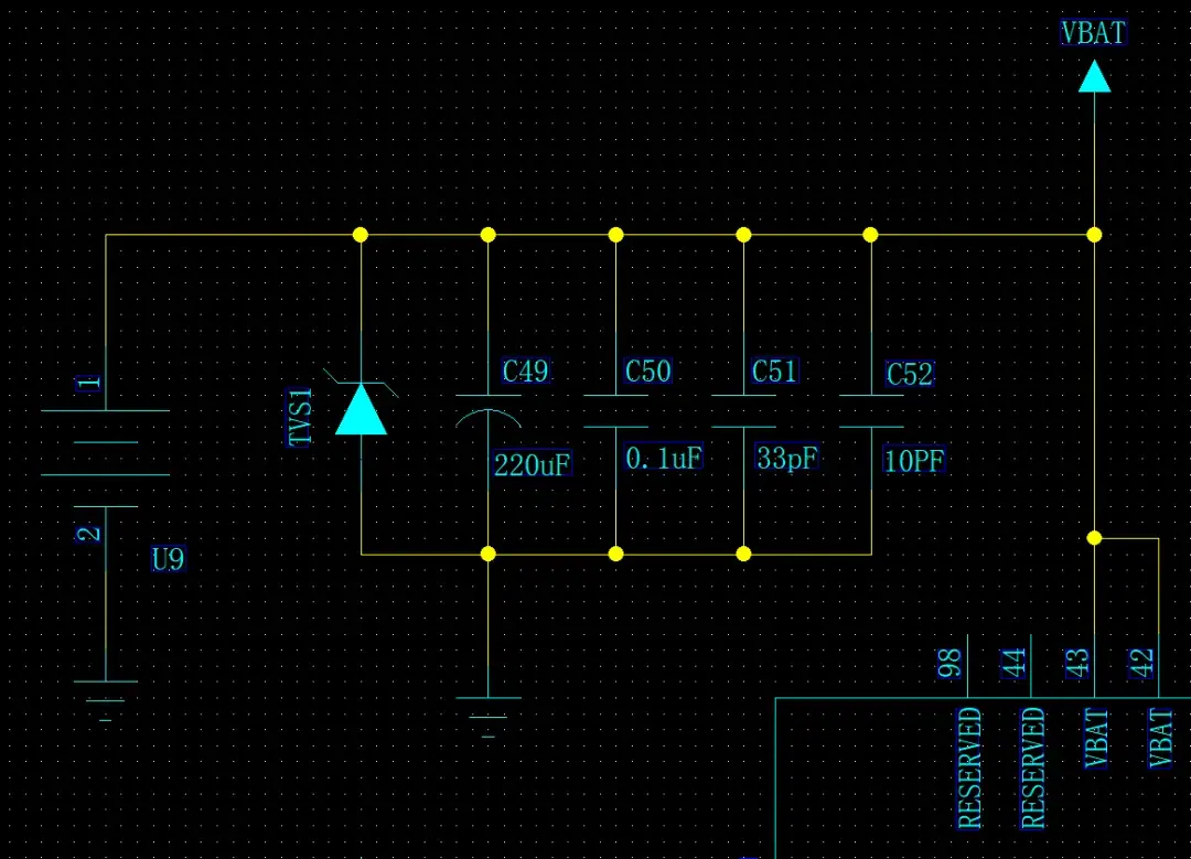 由于锂电池的低内阻和高放电能力,加上本身应用于便携式产品,空间尺寸优先。因此本不需要较大的电容,但是考虑到实际PCB电源走线长度以及电池连接器接触阻抗和电池引线长度等会引入额外的不确定的阻抗,因此会建议酌情加上220uF电容,建议选用低ESR的钽电容。
