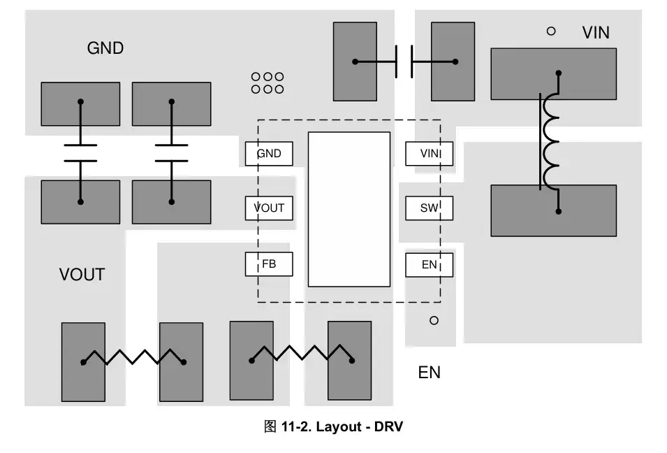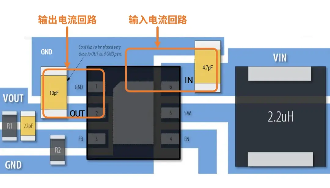 上图输入电容和输出电容直接放置在输入输出管脚的近端,同时电容地管脚直接就近连接到芯片的地管脚,从而整个输入输出电流环路面积最小。