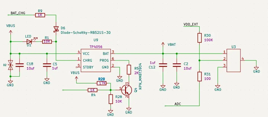 2、充电芯片CHRG管脚为充电指示管脚,通常为开漏输出,需要VBUS输入电源上拉,同时可以通过二极管做隔离同时连接到主控MCU GPIO管脚做充电状态判断。