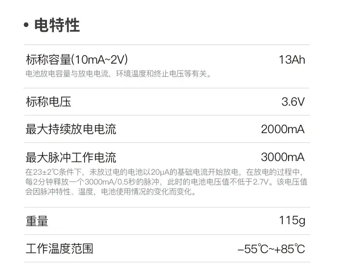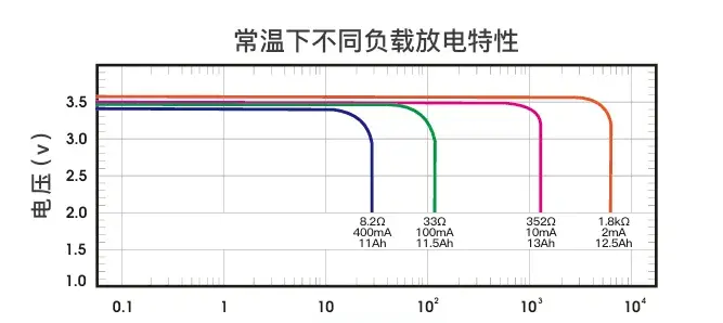 锂亚电池在其90%以上的容量上都能保持3.6V左右的放电电压,在功率型锂亚电池瞬时放电能力达到大于1A。