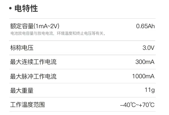 锂锰电池工作电压在2.5V~3.0V左右,瞬时放电能力在1A左右。
