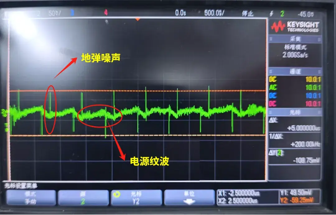 呈现三角形,幅度相对较小的电源纹波;尖峰脉冲幅值较大的地弹噪声。