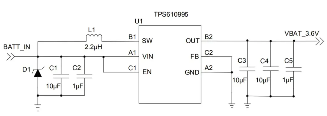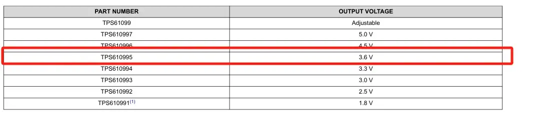 这里推荐TI的TPS610995升压芯片(固定3.6V输出版本)。TPS61099x器件是一款具有1µA超低静态电流的同步升压转换器。该器件专为由碱性电池、镍氢充电电池、 锂锰电池或锂离子充电电池供电的产品而设计,能够在轻载条件下高效运行,这对延长电池使用寿命至关重要。