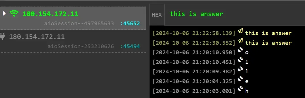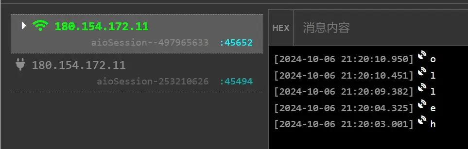点击左下角的16进制显示按钮后,同时显示ascii和16进制的消息日志。