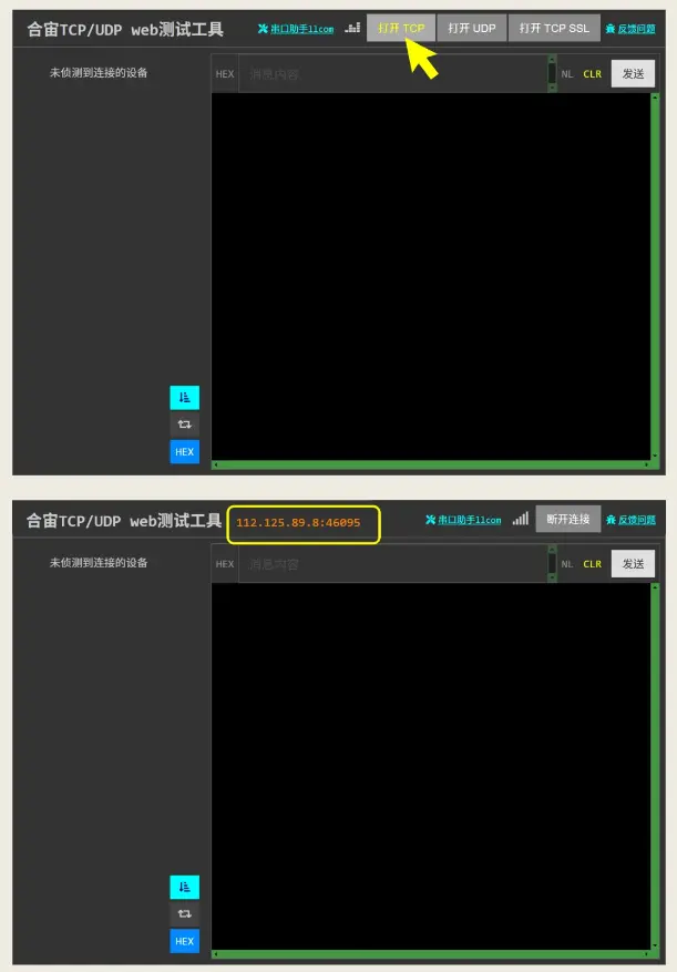 02. 终端在代码里面填上对应的IP:112.125.89.8,TCP端口填上46095,然后打开Socket;