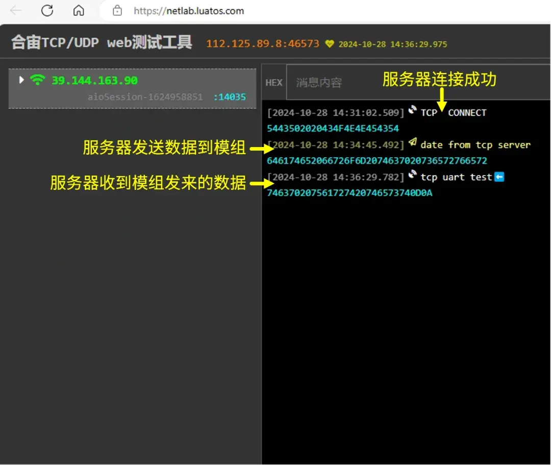 04. 终端发送数据给云端,TCP/UDP web测试工具会显示收到的内容: