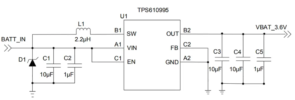 升压参考方案 对于升压方案的选择,低静态功耗是核心,才能满足超长待机的应用要求。这里推荐TI 的 TPS610995升压芯片(固定3.6V输出版本)。TPS61099x 器件是一款具有 1µA 超低静态电流的同步升压转换器。该器件专为由碱性电池、镍氢充电电池、 锂锰电池或锂离子充电电池供电的产品而设计,能够在轻载条件下高效运行,这对延长电池使用寿命至关重要。如下是参考设计。