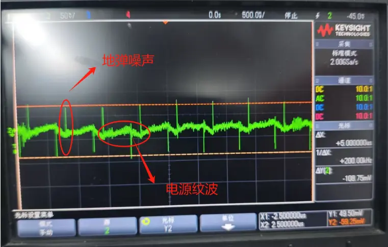 上图波形能看到两种周期性的波形:呈现三角形,幅度相对较小的电源纹波;和尖峰脉冲幅值较大的低弹噪声。