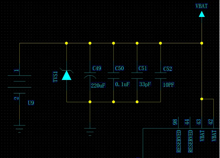 C49 220uF是补能电容,由于锂电池的低内阻和高放电能力,加上本身应用与便携式产品,空间尺寸优先。因此本不需要较大的电容,但是考虑到实际PCB电源走线长度以及电池连接器接触阻抗和电池引线长度等会引入额外的不确定的阻抗,因此会建议酌情加上220uf电容,建议选用低ESR的钽电容。