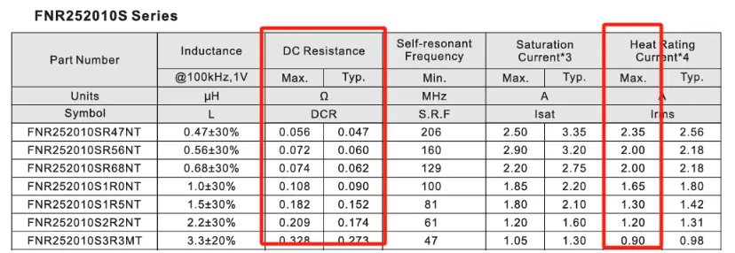 等效直流阻抗(DCR), 也就是功率电感的内阻,主要影响电感的发热,较大的内阻会使得功率电感温度更容易升高,从而降低功率电感的感值和饱和电流。通常功率电感的内阻通常与封装大小直接相关,相同感值下封装更大的电感往往内阻较小。