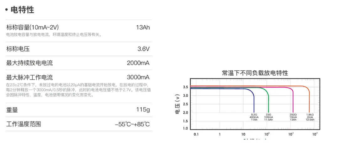 锂亚硫酰氯(Li/SOCl2)电池 :能量最高的一种电池,不可充电,比能量可达590W·h/kg和1100(瓦时每立方分米)。锂亚电池在其90%以上的容量上都能保持3.6V左右的放电电压,在功率型锂亚电池瞬时放电能力达到大于1A,放电曲线如下图。能够满足于Cat.1通信模块的供电要求。所以对于使用功率型锂亚电池只需直接给Air780EP模块供电即可,无需做升压设计。