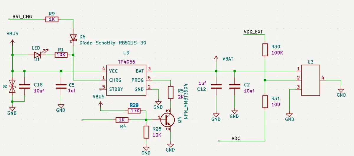 充电芯片PROG管脚用于配置恒压充电下的充电电流,由R5电阻的阻值进行设置,具体参考实际的芯片规格书。建议加上Q4 NPN作为充电控制管脚,可以通过MCU或者Air780EP GPIO进行控制,注意Q4的口控制管脚要用VBUS上拉,同时分压到IO电平对应的电压,达到充电芯片默认开启状态。