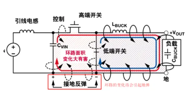 输入电容和输出电容与DCDC芯片共同构成电流回路,也就是两者回路面积越大,产生的磁通量变化越大,也就是产生地弹噪声越大。因此想要尽可能的最小化噪声,就要在输出电容和输入电容的办法上做文章。