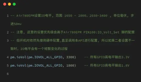 任何情况下,无论Air780EPM的PIN100:IO_Volt_Set是悬空还是下拉到GND,IO高电平都是以本函数的设置为优先。