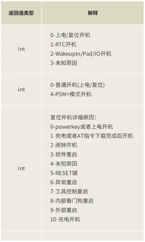 除从PSM+模式到低功耗模式或常规模式的开机之外,还有关机状态下的PWRKEY开机、常规模式/低功耗模式/PSM+模式下的Reset重启,闹钟开机、软件重启、LuaTools等工具控制重启、内部看门狗重启、外部重启以及程序跑飞下的异常开机等。