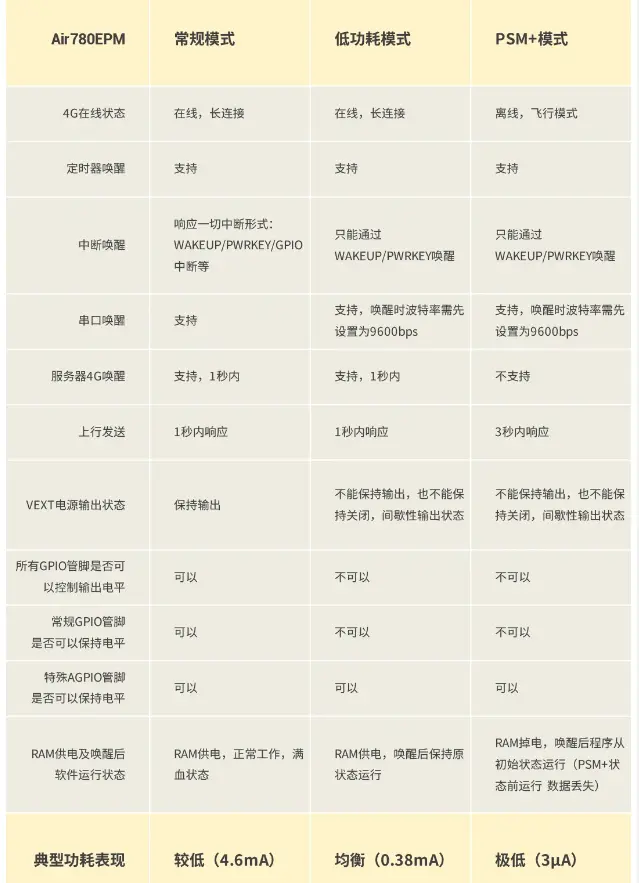 Air780EPM三种功耗模式的介绍,“常规模式”、“低功耗模式”、“PSM+模式”,以及典型实网环境条件下的功耗测试数据,如下表所示: