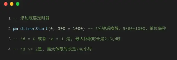 定时器id;Air780EPM可以设置多个定时器,不同的定时器ID代表不同的定时器进程;一般来说,定时器进程不要超过6个。相应的,定时器ID的取值范围是0-5; 其中,0和1的最大休眠时长是2.5小时,2到5的最大休眠时长是740小时。