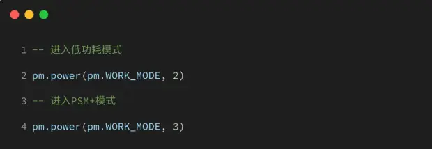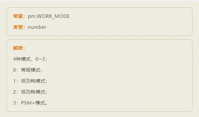 历史原因,pm.WORK_MODE在LuatOS中定义了4个模式,但是,就Air780EPM这一特定型号来说,为了方便理解和简化设计,只定义了3种功耗模式,所以就出现了1和2都是低功耗模式的结果。