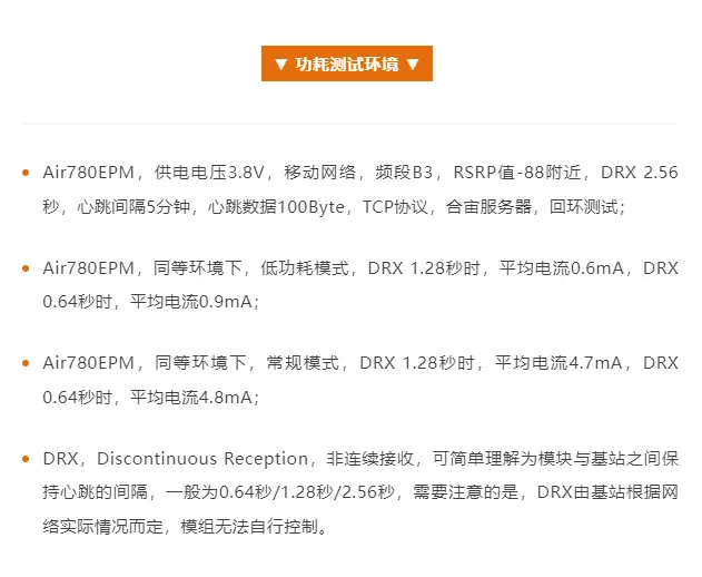 实际环境下,信号质量、DRX间隔等都是由模组所处环境的基站决定,模组并不能自行设置。因此,功耗表现可能与测试数据有差异。