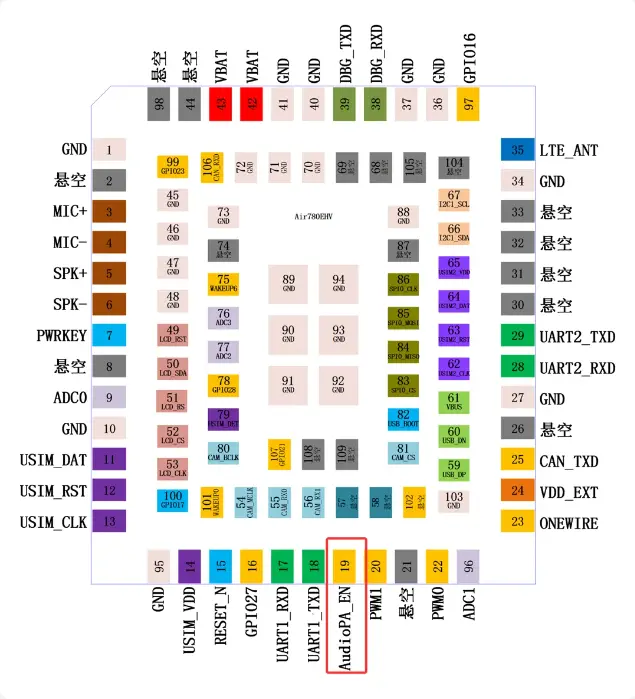 Air780EHV需要在外部增加Audio PA电路:相应的控制GPIO我们默认推荐使用GPIO22,也就是PIN19:AudioPA_EN。