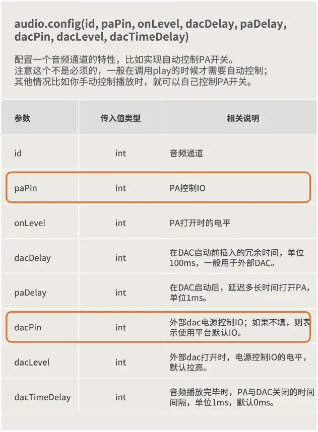 audio.config()跟硬件相关,主要是两个GPIO的配置。