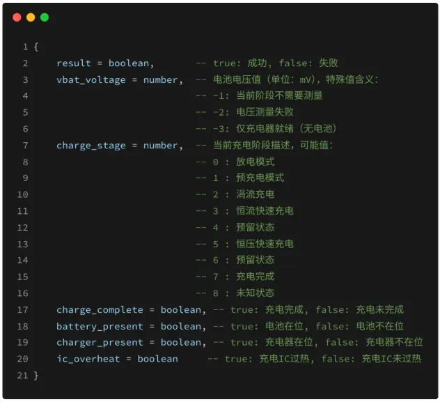 该函数用于获取当前充电系统的完整状态,包括电池电压、充电阶段、充电状态、电池在位状态、充电器在位状态以及IC过热状态等信息。