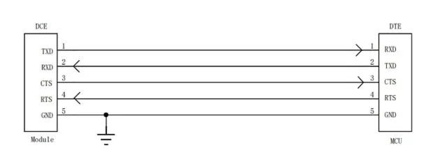 在物联网串口应用中,通常保留TX/RX加流控管脚的5线串口形式,但模组的CTS管脚起标准RTS功能,RTS管脚起标准CTS功能。