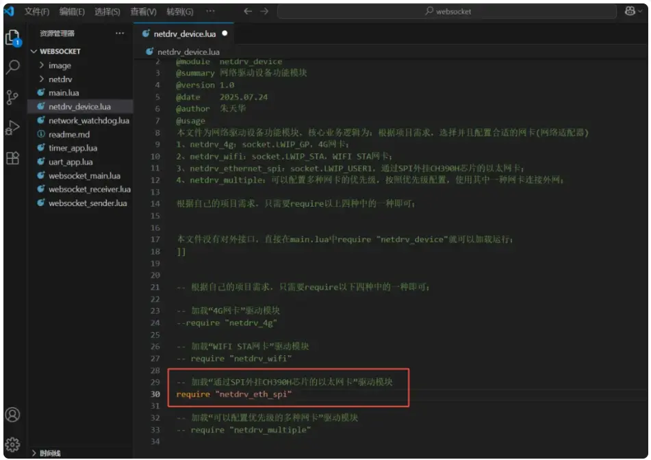 在netdrv_device.lua代码里只打开require "netdrv_eth_spi",其他驱动模块注释掉;