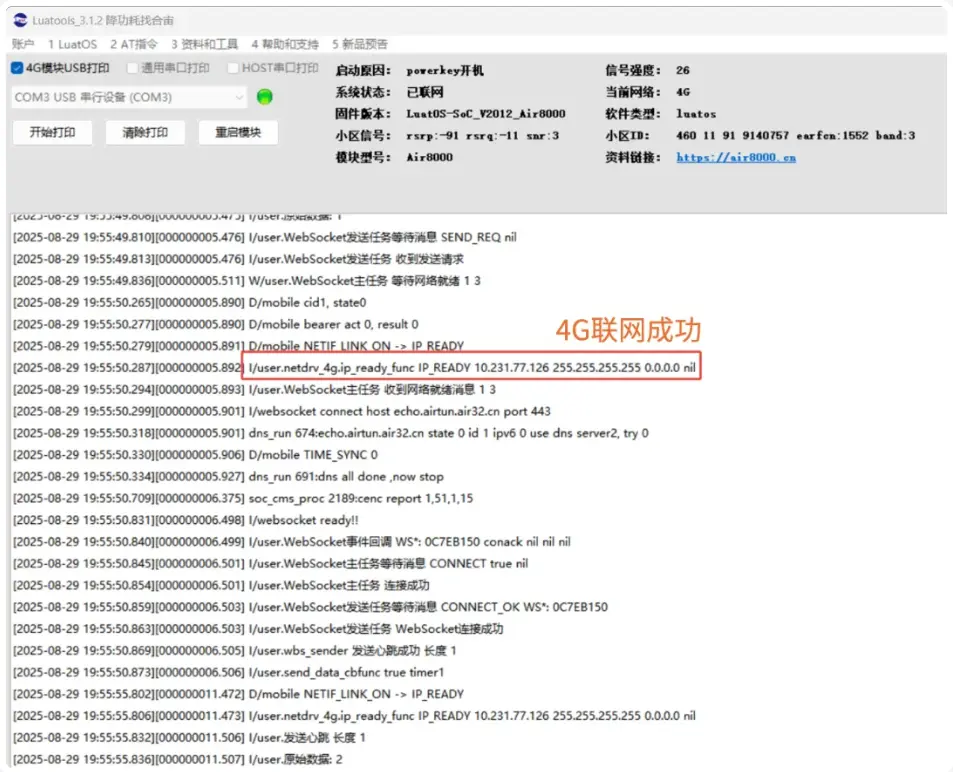 LuaTools工具日志打印如下图所示,如出现类似日志,则表示4G网卡连接成功。