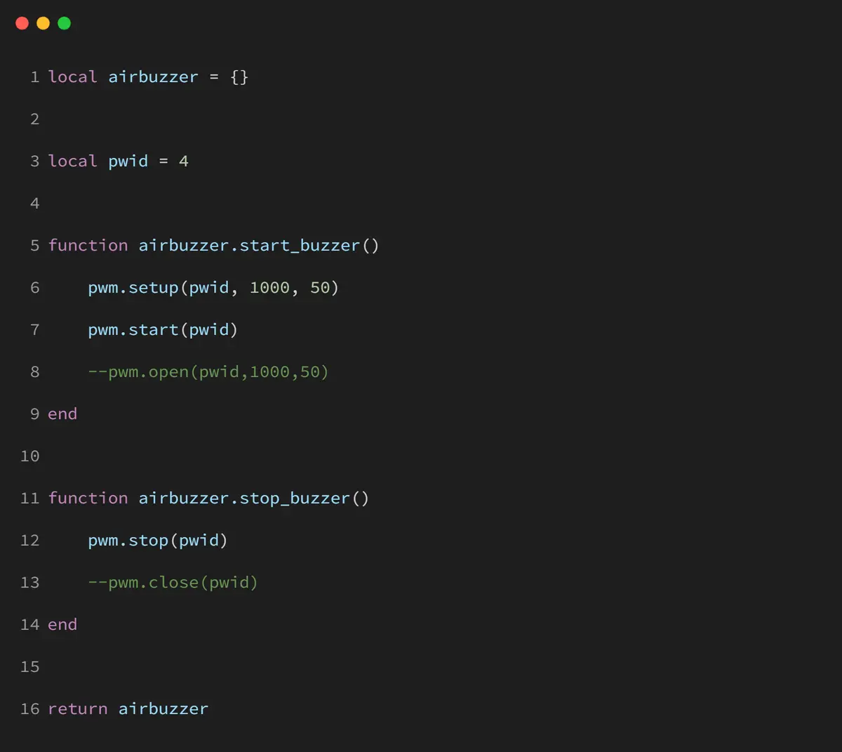2, airbuzzer.lua 封装了驱动蜂鸣器的功能实现;