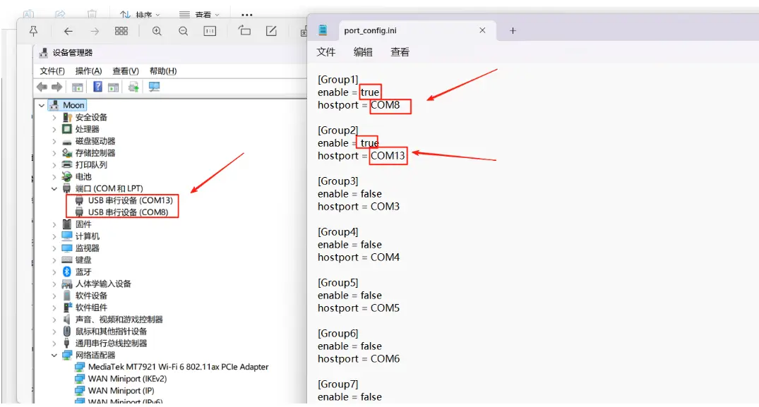 此处用了两块 Air780EPM 开发板来演示批量烧录,打开 PC 的设备管理器,开发板按着下载键后上电按开机键,分别进入 Boot 下载模式,记录端口号:USB 串行设备(COM**),在 port_config.ini 文件中修改端口配置,如下图示: