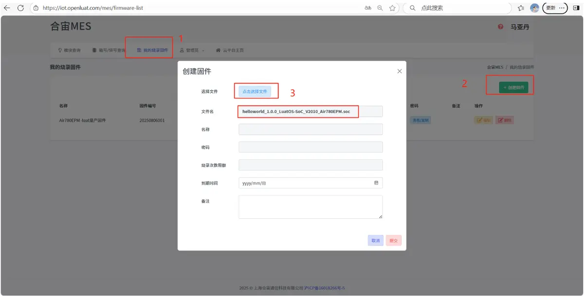 按下述步骤上传文件:我的烧录固件--> 创建固件--> 点击选择文件,此处选择上面生成的量产烧录文件。