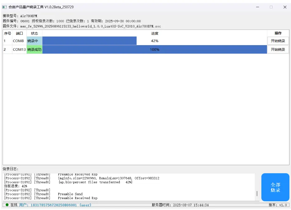 或者点击全部烧录,会烧录当前所有配置好的模组。
