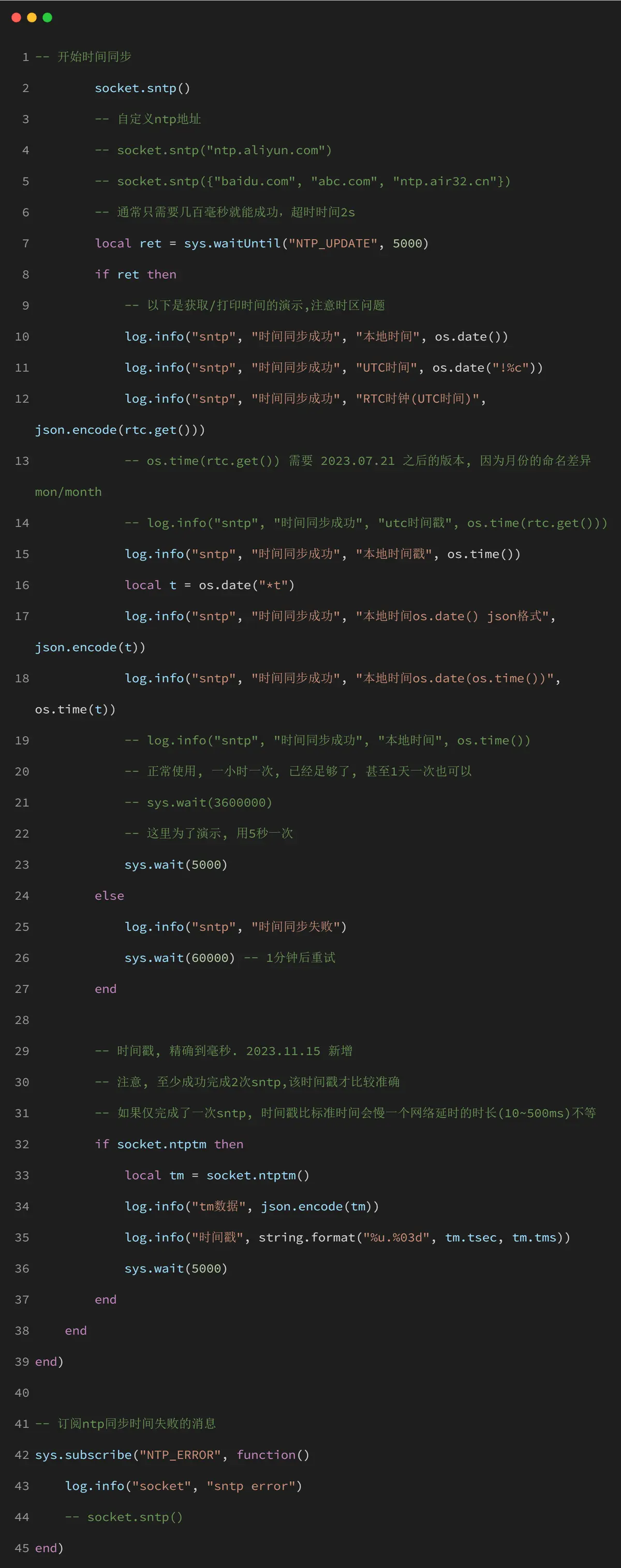 默认的ntp服务器为ntp.aliyun.com,自定义ntp地址可以通过socket.sntp("ntp.aliyun.com")设置。