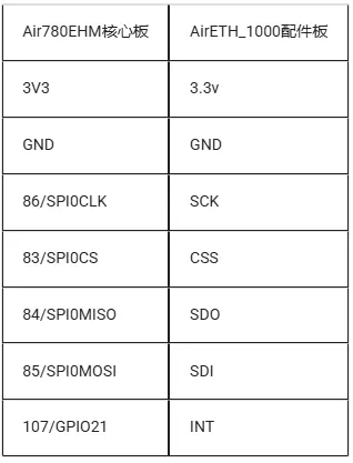 2.2.3 必选 AirPHY_1000 配件板一块,Air780EHM 核心板和 AirPHY_1000 配件板的硬件接线方式为: