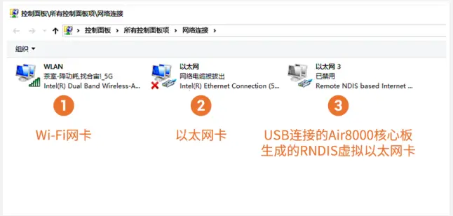 我们先来看一张电脑上的网卡图片,图片中有Wi-Fi网卡、标准的物理以太网卡、虚拟的USB RNDIS以太网卡三种网卡: