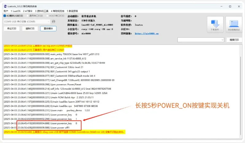 Air8000支持LuatOS开发,应用示例持续更新中。开关机键demo示例相关资料,可通过下方链接获取。