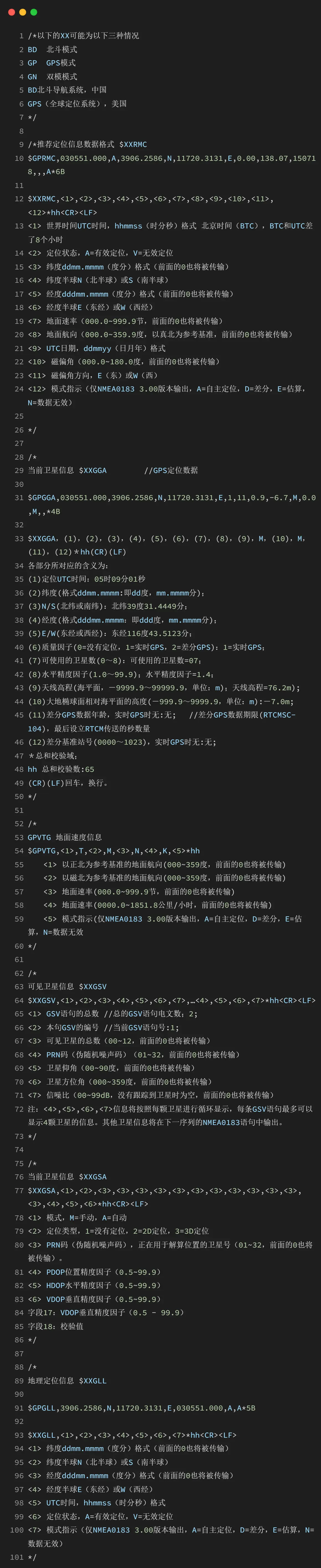 5、hh:校验和(check sum),$ 与*之间所有字符 ASCII 码的校验和(各字节做异或运算,得到校验和后,再转换 16 进制格式的 ASCII 字符)