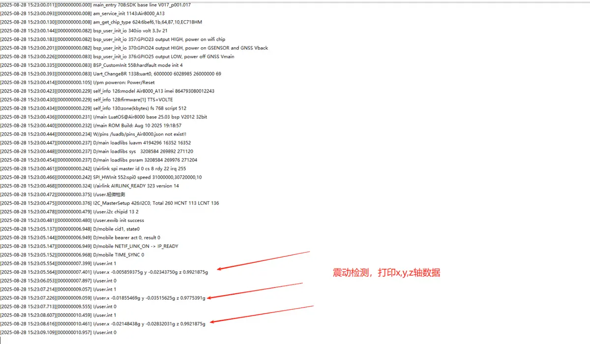 本示例介绍了如何用 Air8000 开发板展示内部三轴加速度传感器的震动触发功能。