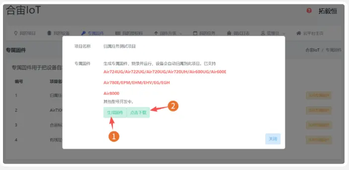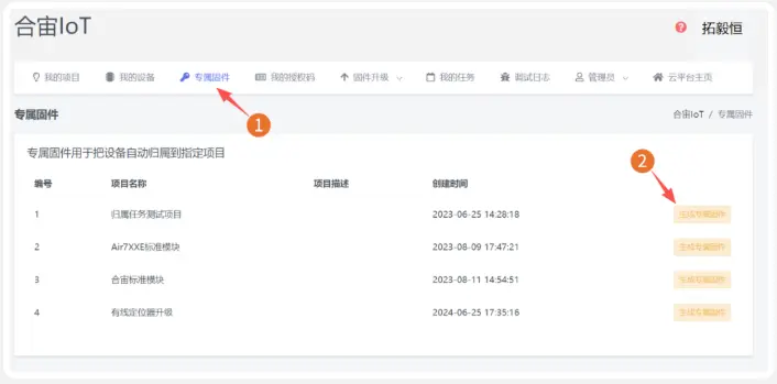 接下来开始进行归属操作,首先点击【专属固件】,生成我们需要归属项目的专属固件。
