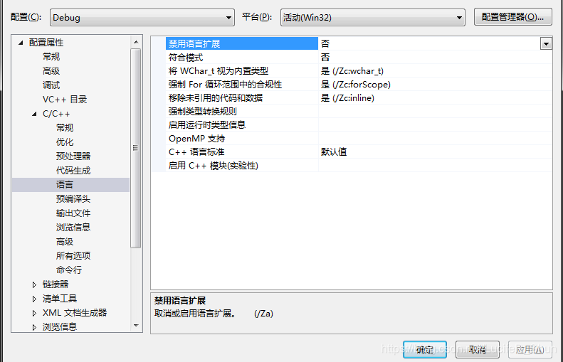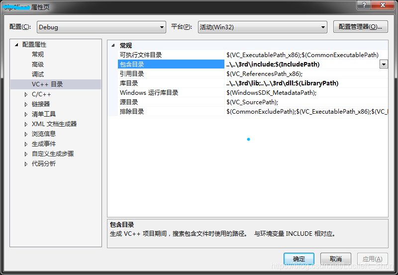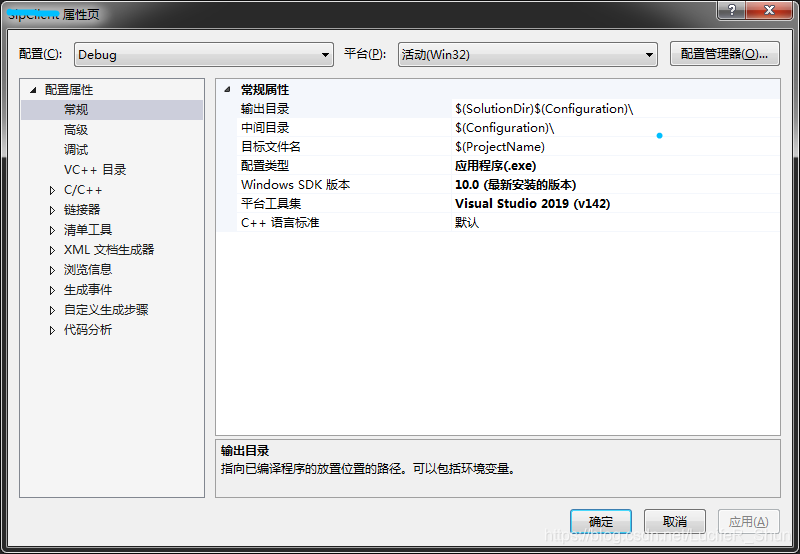 Debug表示正在配置的是Debug,也可以改成Release 平台同理 关系你调试时的选择