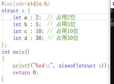 首先,需存储成员a,a占用2个bit位,0~7为一个字节,从左往右存储还是从右往左存储没有一个统一的标准,我们假设从右往左存储,则6~7为a的存储空间,3~5为b的存储空间,由于b前面仅有两个比特位,c占10个比特位,显然不够,因此只能丢弃1~2两个比特位,c存储在8~17这十个字节,同理,17~32仅有16个bit位,d需要30个bit位,显然不够,因此需开辟新的内存空间,大小为4个字节,c存放在32之后的30个比特位,因此,结构体s的大小为4+4=8个字节。
