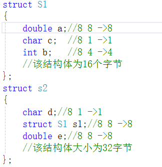 由上述可知,double类型的a存放在0~7位置,为8个字节,char需存放在其对齐数的整数倍的地址处,对齐数为1,故char c存放在地址为8的位置,同理,b需存放在其对齐数4的倍数的地址处,故b存放在地址为12的位置,占4个字节,整个结构体从0~15为16个字节,刚好为最大对齐数4的整数倍,因此,该结构体的大小为16个字节。同理,可分析得出S2结构体为32字节。