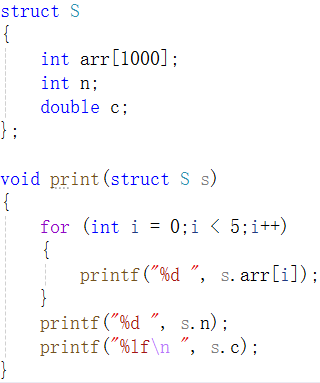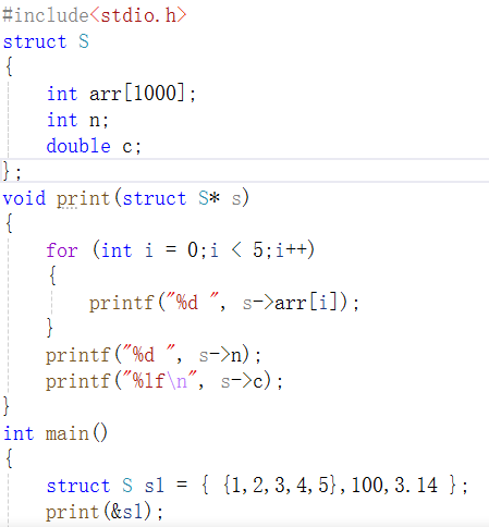 这里print函数的参数为结构体变量名,通过结构体变量名进行传参,可知建立形参所需的内存空间是很大的,因为要建立arr一千个元素的堆栈空间,那有没有更节省空间的方法呢?答案是肯定的,可以将结构体指针作为函数参数,指针作为函数参数,指针只占4个或8个字节,相比结构体名传参,大大节省了内存空间,指针指向结构体成员,用->表示。
