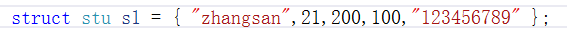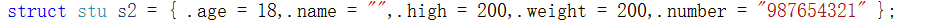 对struct stu s1结构体进行赋值,采用第一种方法,即一对一对应,每个结构体成员用逗号隔开,这种赋值方法简单明了,也清晰直观。zhangsan对应成员name[20],21对应成员age,200对应成员high,100对应成员weight,123456789对应成员number[20]。