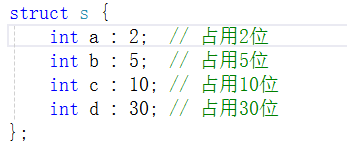 位段表示采用成员名:位大小;进行表示,如上图所示,其内存存储方式采取一个字节内可存储多个成员,在字节大小允许的情况下,若字节大小不够,则需重新开辟一个新的int来存储。